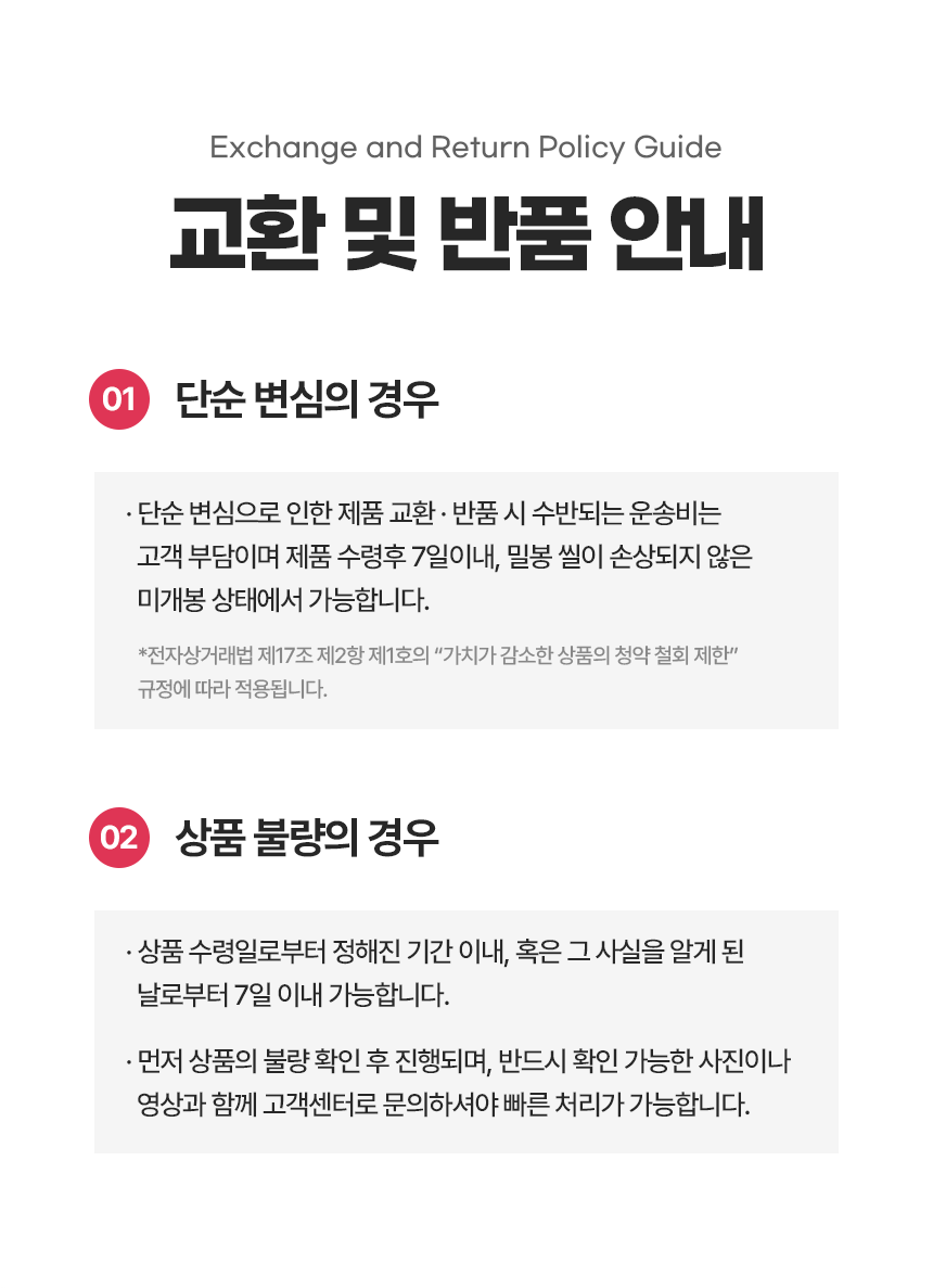 ※단순 변심으로 인한 교환,반품을 하실 경우, 제품의 왕복배송 비용은 고객께서 부담하셔야합니다.